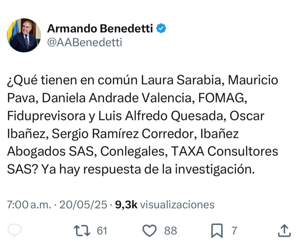 “¿Qué tienen en común Laura Sarabia, Mauricio Pava, Daniela Andrade Valencia, FOMAG, Fiduprevisora y Luis Alfredo Quesada, Óscar Ibañez, Sergio Ramírez Corredor, Ibañez Abogados SAS, Conlegales, TAXA Consultores SAS? Ya hay respuesta de la investigación”, escribió Benedetti a las 7:00 a.m. desde su cuenta oficial de X.
