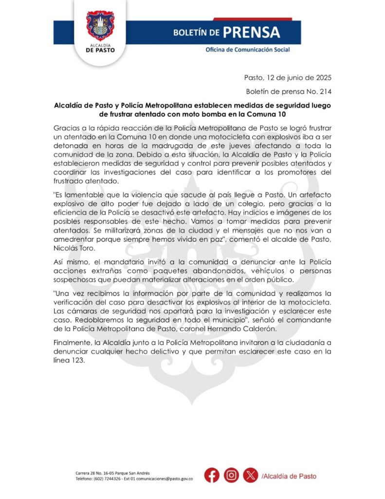 Una amenaza sacudió la tranquilidad de los habitantes de Pasto este martes, tras la aparición de una moto bomba instalada cerca al Colegio Pedagógico. La rápida intervención de las autoridades permitió desactivar los explosivos antes de que causaran una tragedia, pero el hecho ha generado un profundo clima de inseguridad y preocupación entre la comunidad educativa y los ciudadanos en general.