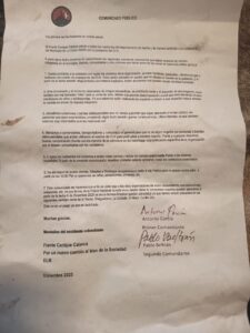 El panfleto también advierte a los comerciantes y transportadores de la comunidad en general para que no se dejen engañar por personas o bandas delincuenciales que utilicen el nombre del ELN para pedir dinero, pidiendo a quienes reciban estas notificaciones que busquen comunicación directa con los mandos de la estructura.