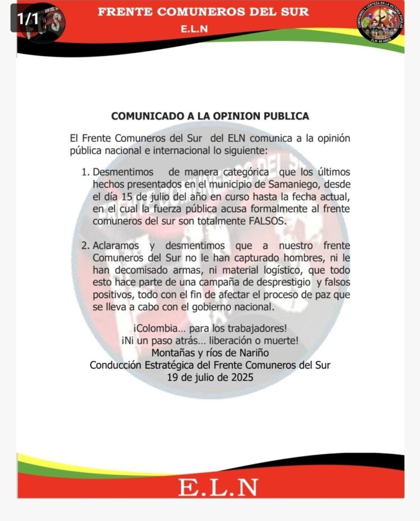 El Frente Comuneros del Sur del Ejército de Liberación Nacional (ELN) emitió este 19 de julio un comunicado dirigido a la opinión pública nacional e internacional, en el cual desmienten categóricamente los recientes señalamientos realizados por la fuerza pública sobre presuntas capturas y decomiso de armas en el municipio de Samaniego, Nariño.