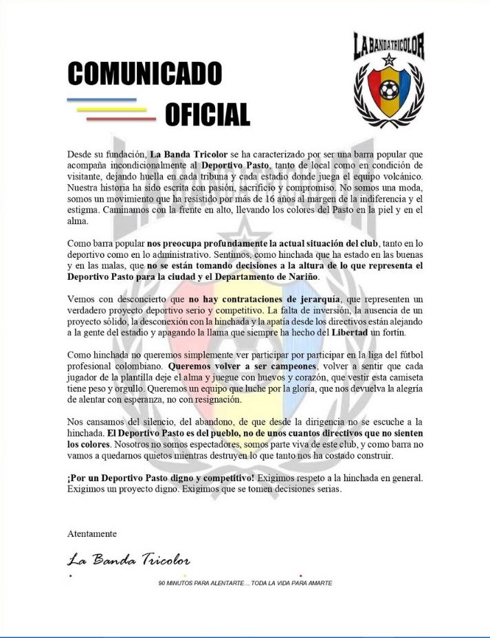 A través de un comunicado oficial, la barra popular La Banda Tricolor manifestó su profunda preocupación frente a la actual situación deportiva y administrativa del Deportivo Pasto, equipo al que han acompañado incondicionalmente durante más de 16 años.