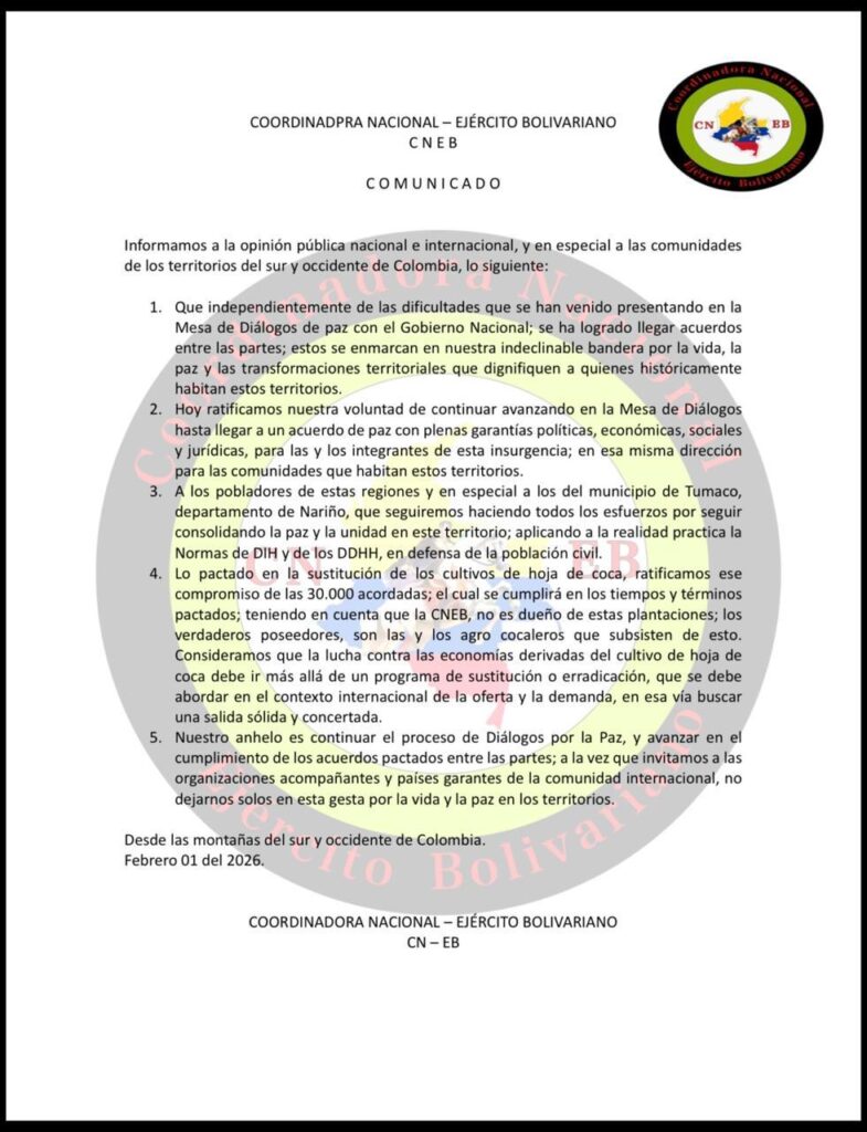 El grupo insurgente ratificó su permanencia en la Mesa de Diálogos con el Gobierno Nacional, enfatizando que la construcción de la paz no es un asunto puramente militar, sino que pasa necesariamente por transformaciones reales en los territorios y el respeto a la vida de sus habitantes.