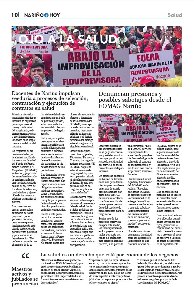 Desde municipios como Pasto, Ipiales, Túquerres, Tumaco y Consacá, los organizadores sostienen: “El FOMAG no puede estar al servicio de ningún partido, ningún operador privado ni ningún funcionario de turno. Es una con- quista histórica del magisterio, y la vamos a defender”.