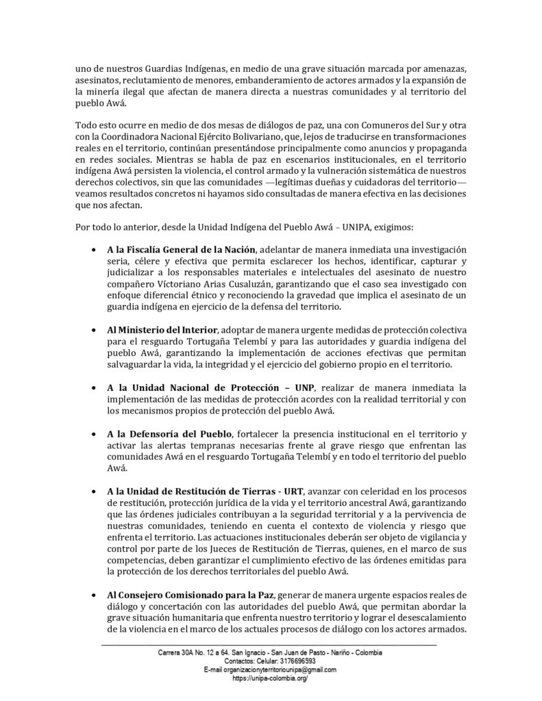 Ante esta situación, se hizo un llamado al Estado colombiano para que se adelanten investigaciones inmediatas que permitan esclarecer lo ocurrido, identificar y sancionar a los responsables, y garantizar medidas efectivas de protección para las comunidades del pueblo Awá.