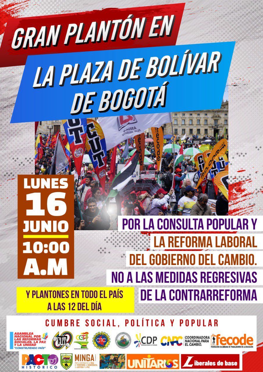Diversos sectores sindicales, sociales y políticos convocaron para este lunes 16 de junio un gran plantón en la Plaza de Bolívar de Bogotá, desde las 10:00 de la mañana, en respaldo a la reforma laboral propuesta por el gobierno nacional y en rechazo a lo que denominan “medidas regresivas de la contrarreforma”.